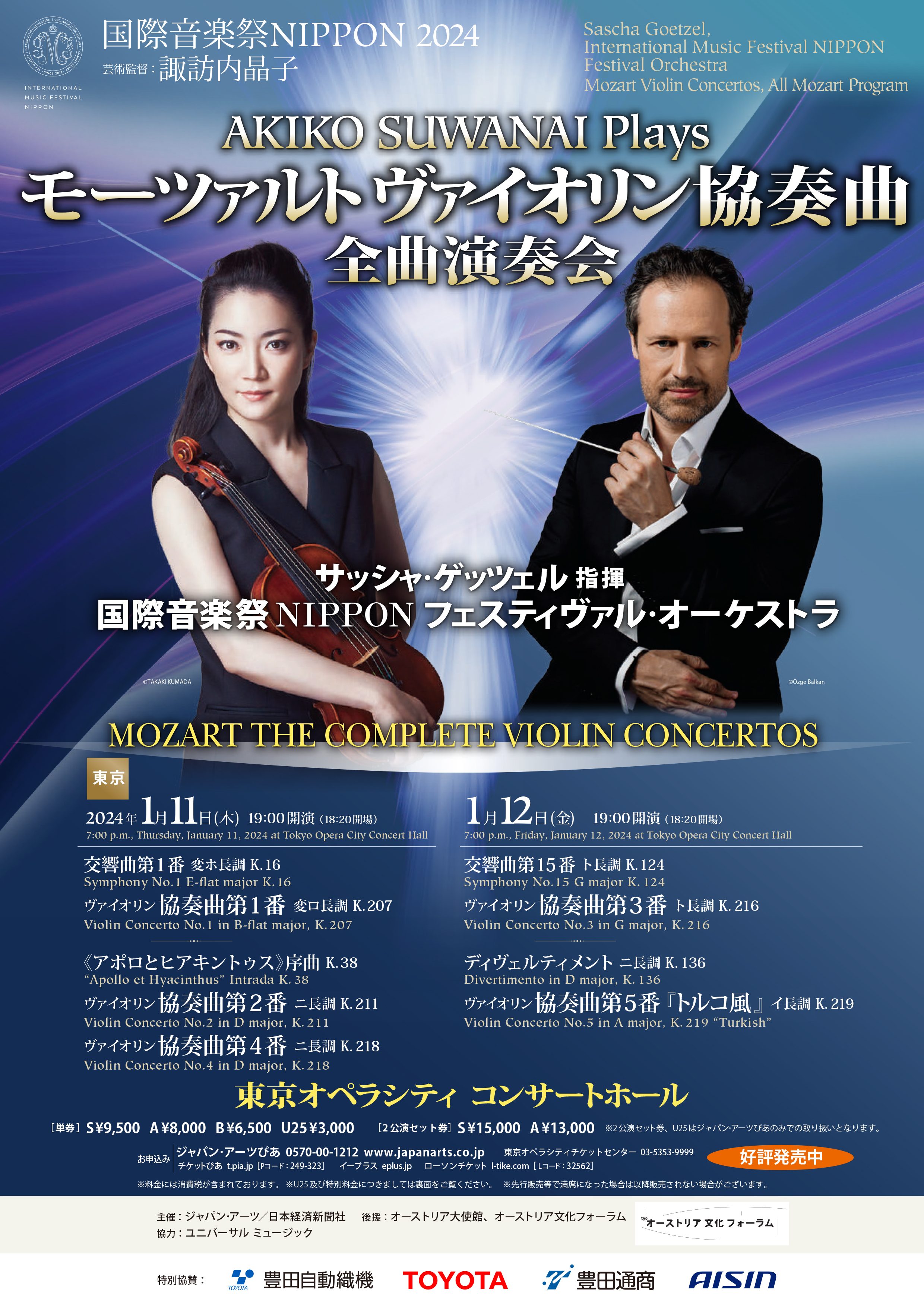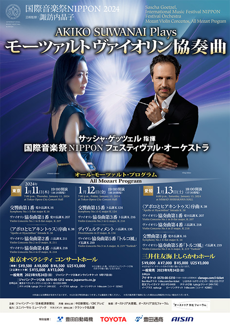 諏訪内晶子による モーツァルト ヴァイオリン協奏曲全曲演奏会は、指揮にサッシャ・ゲッツェルを迎え、国内外の名手たちにより創設されるフェスティヴァル・オーケストラによる演奏をお届けいたします。